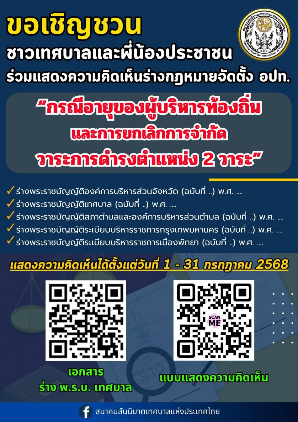 ประชาสัมพันธ์ สมาคมสันนิบาตเทศบาลแห่งประเทศไทยขอความร่วมมือ แสดงความคิดเห็นต่อร่างพระราชบัญญัติเทศบาล(ฉบับที่ ...) พ.ศ..